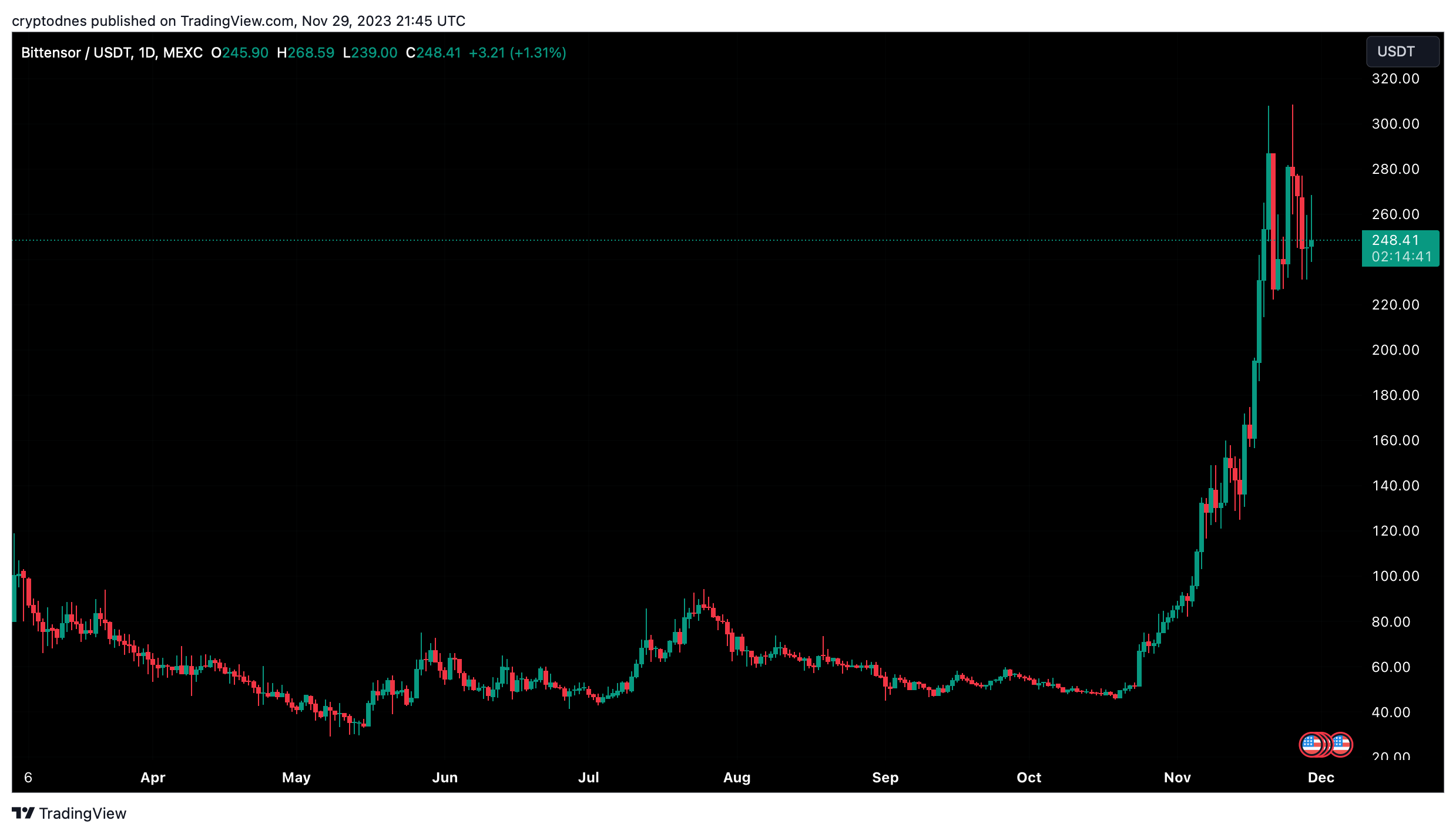 От 24 октомври насам цената на TAO се увеличи доста, отбелязвайки 500% нарастване, с цел да доближи нов исторически връх от $261 в границите на 27 дни.