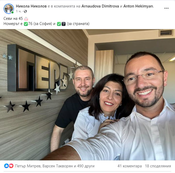Постът в обществените мрежи натрупа стотици лайкове, а измежду поздравите се открояват и пожелания за изборна победа. От фотото излиза наяве, че дружно с тях чества и претендентът за кмет Антон Хекимян.