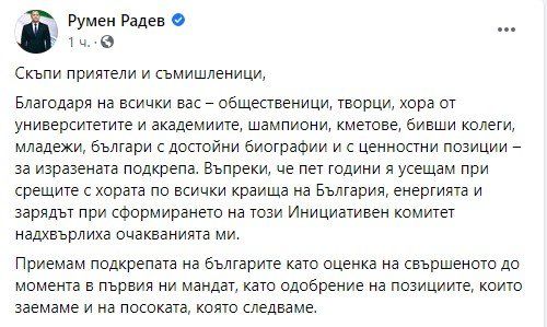 Няколко часа откакто на президента Румен Радев за втори мандат, президентът излезе с позиция във фейсбук, с която благодари за поддръжката.