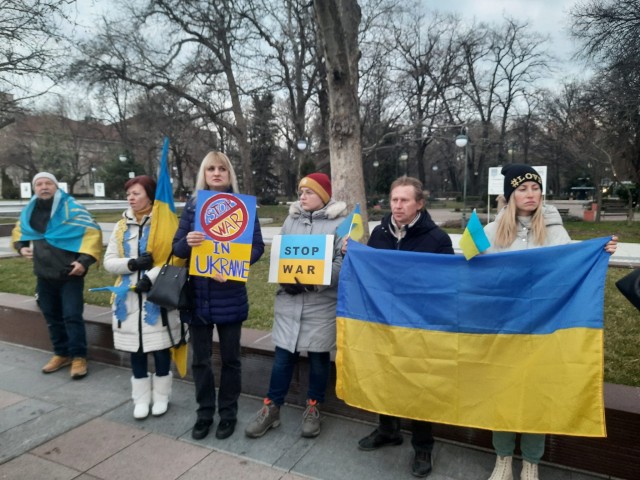 Няколко десетки жители в Пловдив стачкуват против съветската експанзия в Украйна. Сред тях са украинци, които от години живеят в България. Майката на една от протестиращите дами е доктор в Запорожие.