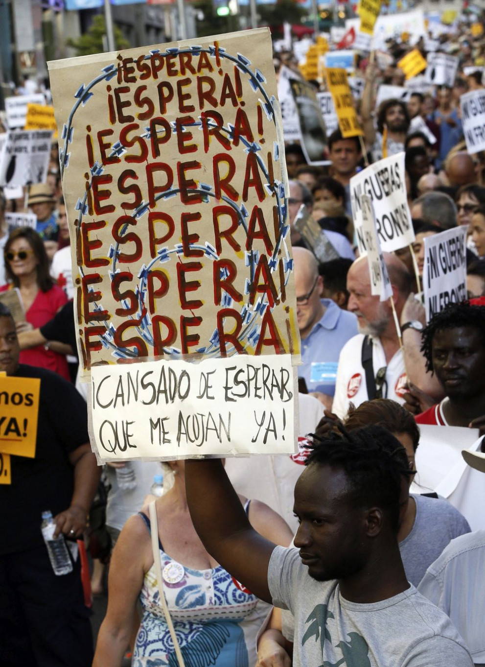 БГНЕС " Никое човешко създание не е нелегално ", скандираха протестиращите, които шестваха в горещината в центъра на испанската столица. Някои носеха плакати с лозунги като " Мостове, а не стени " и " Стига извинения, долу бариерите! "