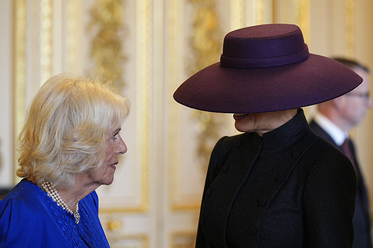По-интересна и провокирала много полемики обаче беше визията на Мелания Тръмп. Ако изборът на тоалет беше съвсем отегчителен – пола и сако в класическо черно – то шапката… тя накара всички да приказват.Ясно е, че при среща с кралското семейство дамите би трябвало да имат шапки и те би трябвало да са специфични, дизайнерски, стилни. Мелания обаче избра прекомерно огромен и прекомерно странна.