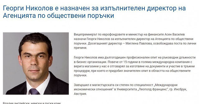 На 2 февруари Георги Николов офиицално бе показан като нов изпълнителен шеф на Агенцията за публични поръчки-АОП. Ето каква биография му бе качена в известие на Министерски съвет и в уеб страницата на АОП.