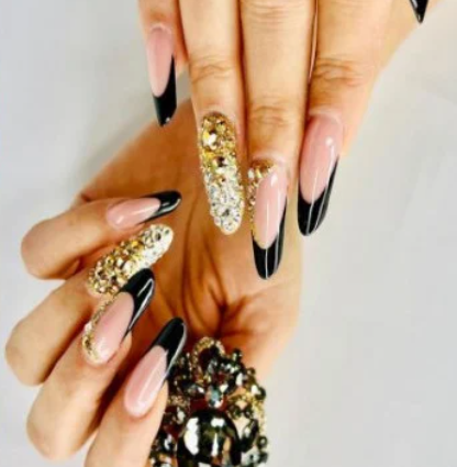 Пръстите на изпълнителката блестят в златисто и черно, а по тях даже има вградени люспи от чисто злато. Предстои да забележим дали това ще е новият тренд измежду ноктите тази пролет.