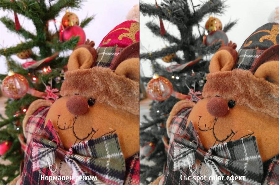 Камерата има и още една любопитна функционалност - може да избирате цвят от изображението, който да оставите, а останалата част да извършите черно-бяла. Ето един образец с тази коледна играчка.