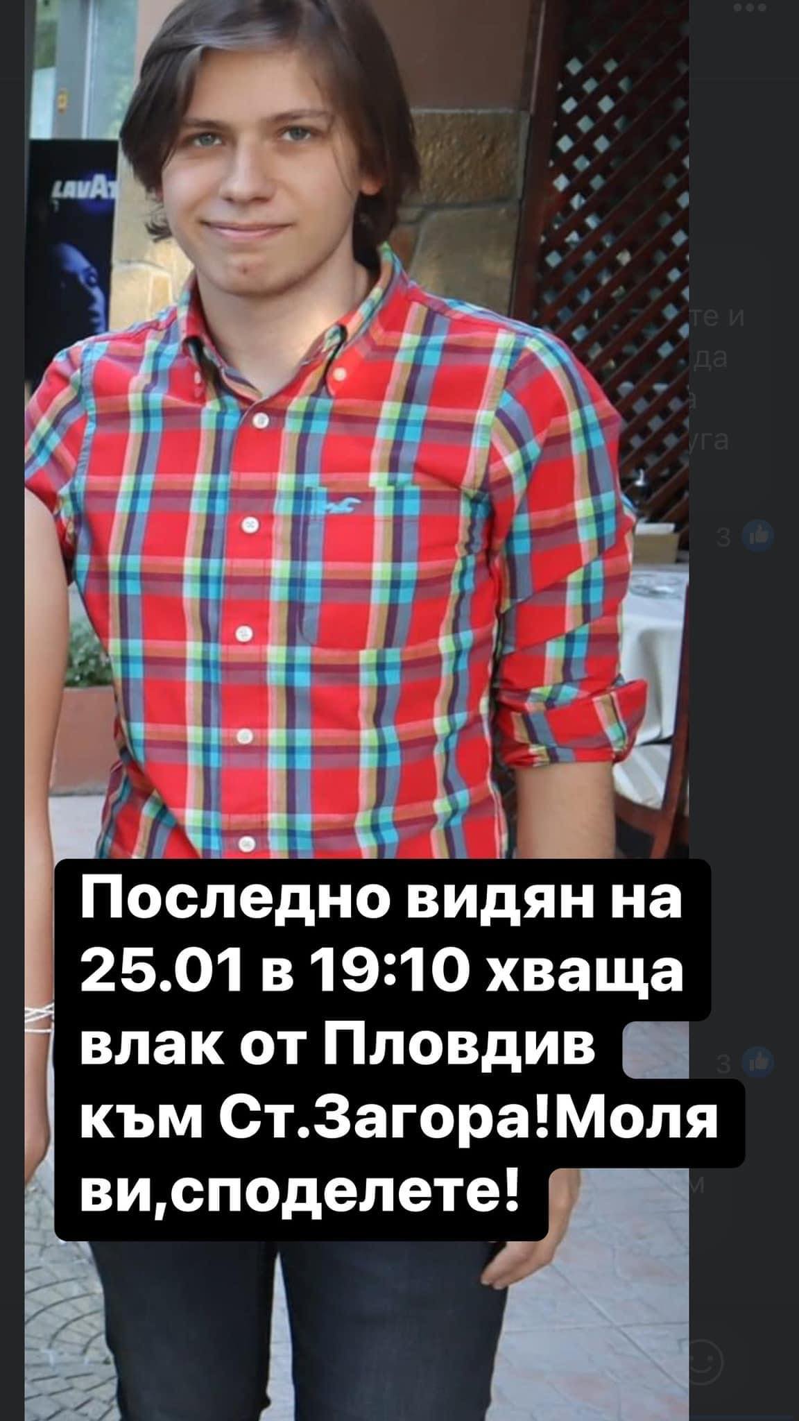 Няма диря от изчезналия Мартин от Пловдив. Той отпътува за Стара Загора с трен тази сряда, а от този момент майка му няма контакт с него.