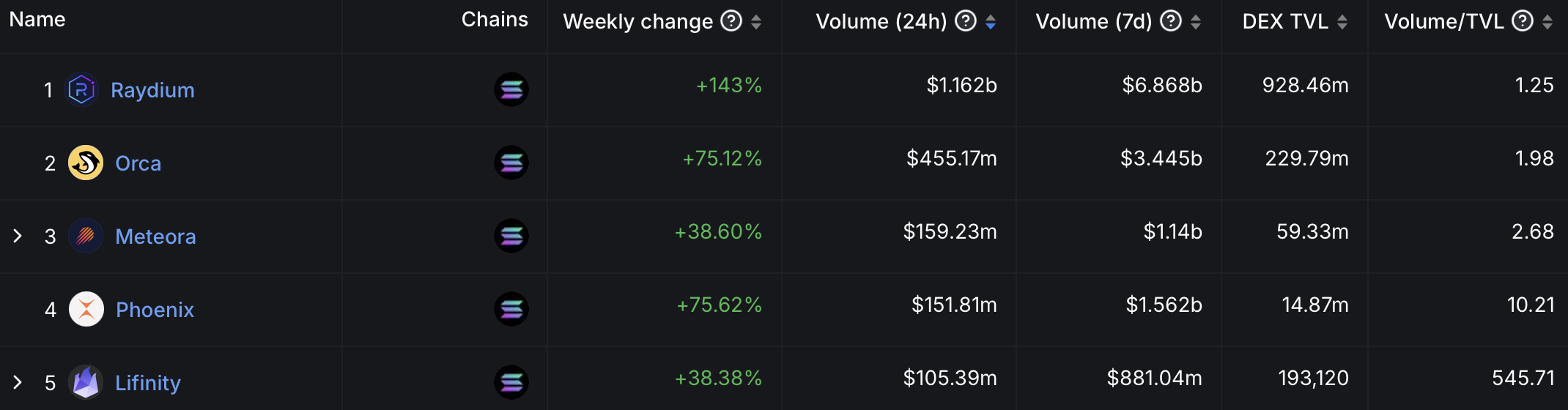Orca, Meteora, Phoenix и Lifinity допълват петте най-големи решения на Solana, като всяко от тях отбелязва нарастване сред 38% и 76% в размера на DEX транзакциите си през последната седмица.