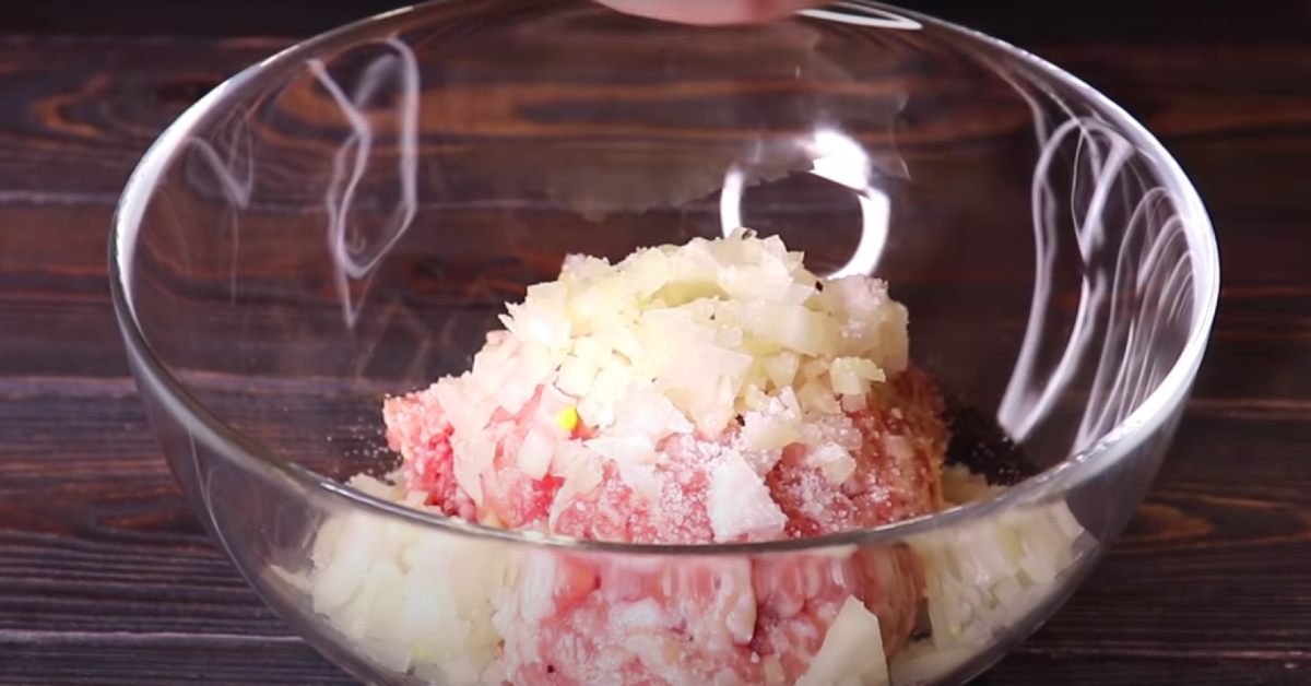 Нарежете лука на дребни кубчета и прибавете към каймата, сол и черен пипер и разбъркайте добре с ръце.