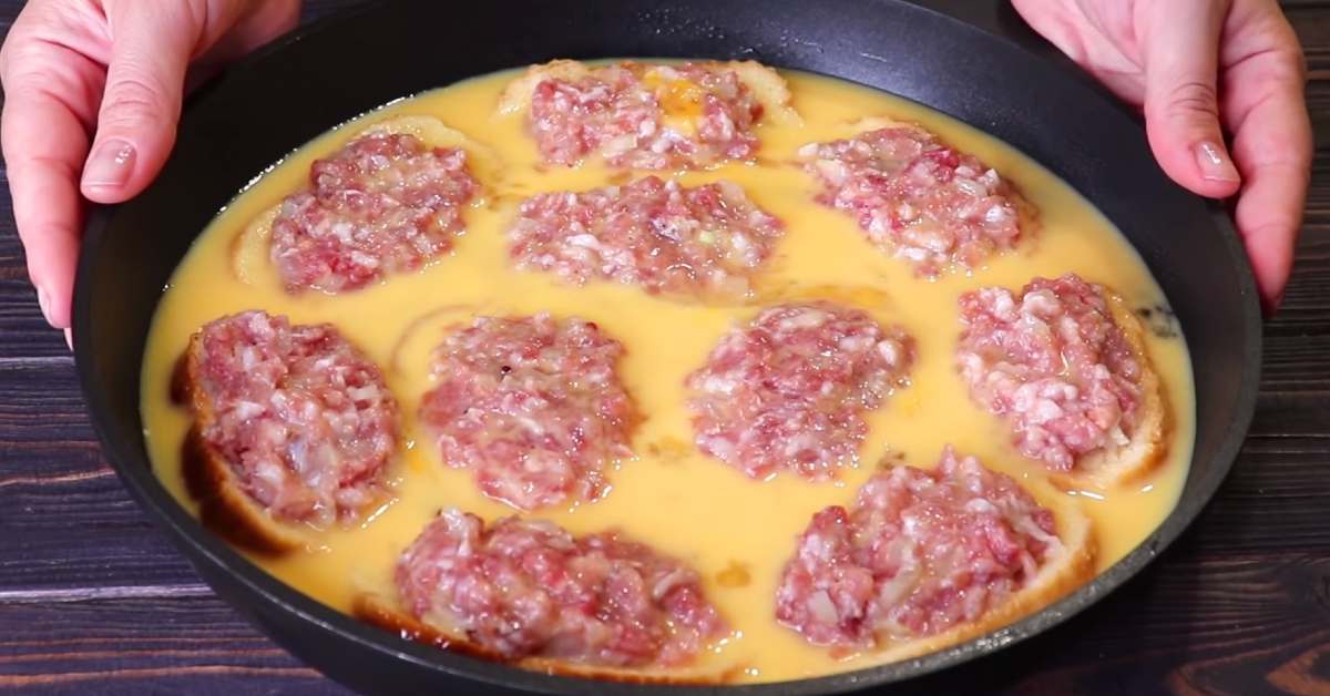 Напълнете каналите с кайма. Разбийте яйцата настрана със 100 мл мляко и щипка сол. Изсипете сместа в хляба и месото