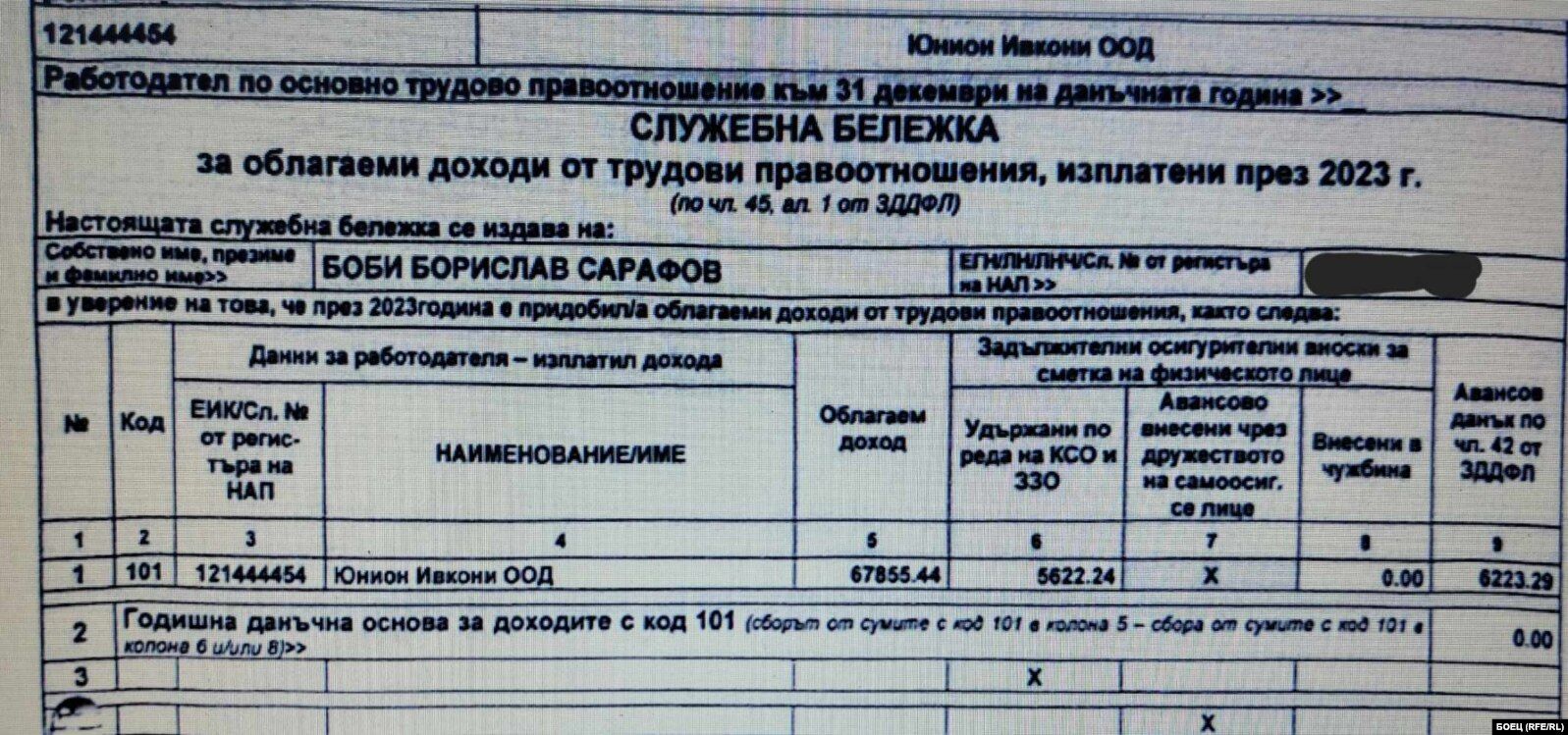 В края на 2024 година гражданското придвижване „ Боец “ обнародва скандални документи, съгласно които синът и някогашната брачна половинка на краткотрайния основен прокурор Борислав Сарафов са получавали огромни заплати от „ Юнион Ивкони “. През 2023 година синът е взел от транспортното сдружение над 67 000 лева, а някогашната брачна половинка – над 56 000 лева