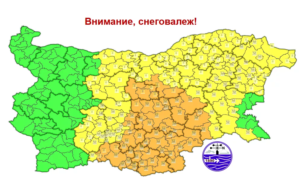Времето в страната ще е облачно, на доста места с превалявания от дъжд, които, с понижението на температурите, в по-голямата част от страната ще преминат в сняг. В южните и крайните източни региони преваляванията ще са от дъжд и сняг, тук-там там ще се образуват и поледици. Значителни по количество ще бъдат в Централна и Източна България.