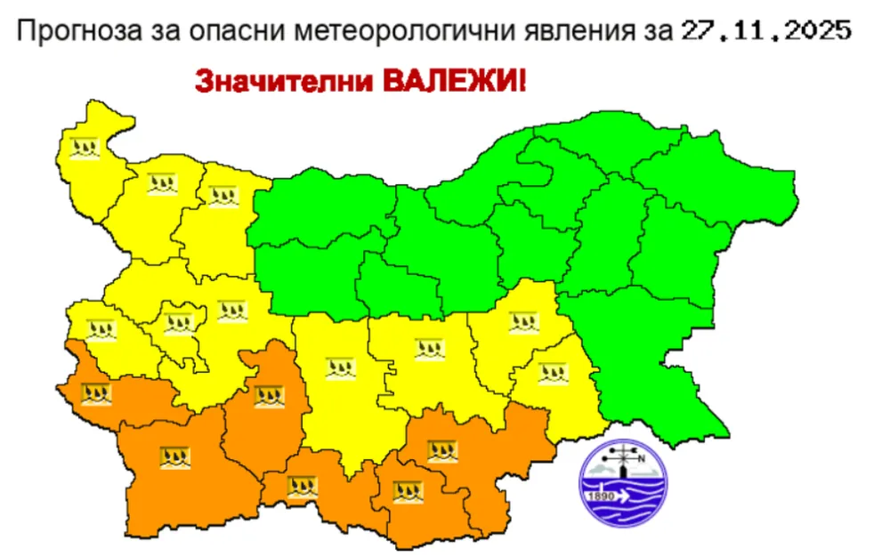 Облачно и дъждовно ще е през днешния ден. Предупреждение за обилни по количество превалявания от дъжд е оповестено през нощта в Западна, а денем и в Централна Южна България, тук-там ще има и гръмотевична активност. Почти без превалявания ще е на изток.