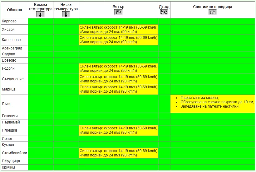 Жълт код за мощен вятър е разгласен за областите: Благоевград, Видин, Монтана, Пловдив и Сливен. Предупреждение за мощен вятър и за сняг и поледици важи за: Варна, Враца, Велико Търново, Габрово, Ловеч, Пазарджик, Плевен, Търговище и Шумен. Жълт код за превалявания от дъжд е в действие за областите Бургас и Хасково, за превалявания от сняг за София област и за Смолян, а за Кърджали – от сняг и дъжд.