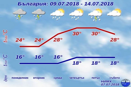 Облачно над по-голямата част от страната, с проливни дъждове, гръмотевични стихии с вероятни градушки. Такава е прогнозата за времето през днешния ден на Националния институт по метеорология и хидрология (НИМХ) при Българска академия на науките.