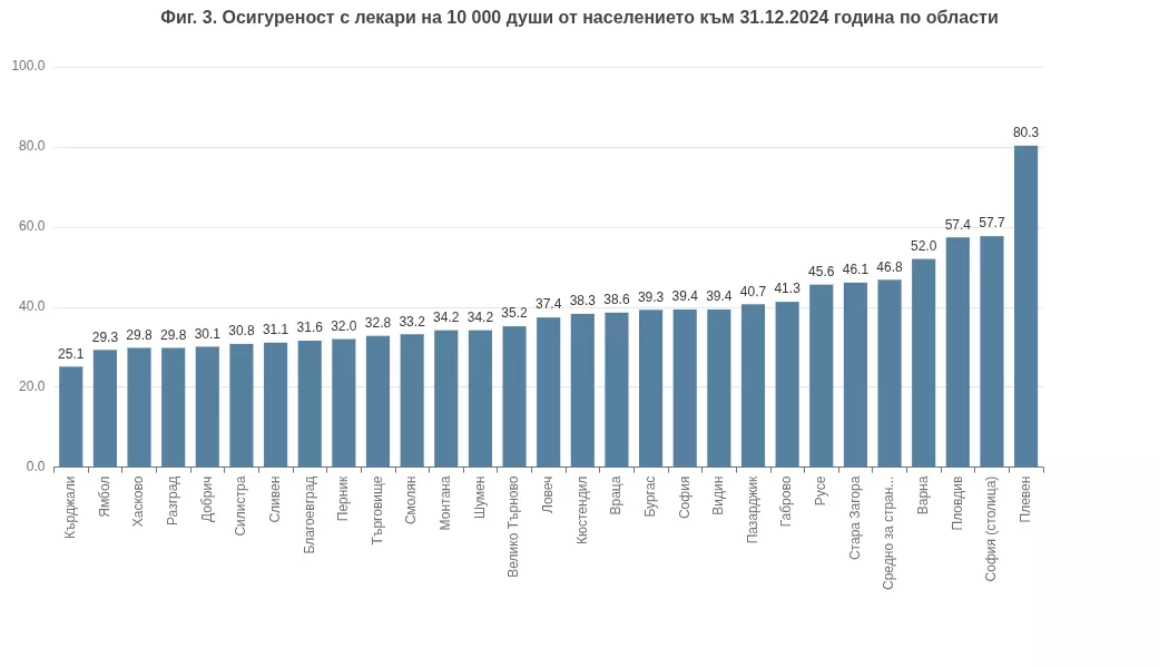 В Пловдив на всеки 10 000 пациенти се падат по 57.4 лекари , което подрежда региона на трето място по осигуреност на медицински личен състав. По този индикатор ни изпреварват само Плевен (80.3) и София-град (57.7). Това е забележителен резултат спрямо националната междинна стойност от 46.8. Областите с най-слаба осигуреност с лекари остават Кърджали (25.1), Ямбол (29.3) и Хасково (29.8), което акцентира сериозните районни несъответствия в достъпа до здравна грижа.