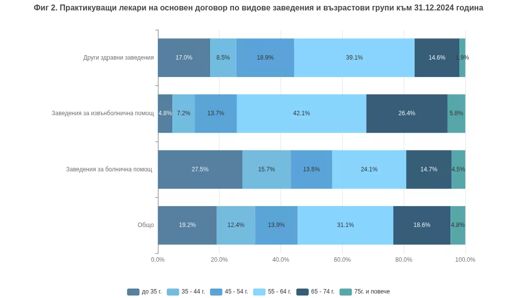 Най-многобройна е възрастовата група сред 55 и 64 години, която обгръща 31.1% от всички лекари – или 9 375 души. На второ място се подреждат младите медици до 35 години – 5 781 души, което съставлява 19.2%. Значителен дял от лекарите са също във възрастовите граници 65–74 години (18.6%). Най-възрастните, над 75-годишна възраст, са 1 441, или близо 5% от всички практикуващи.