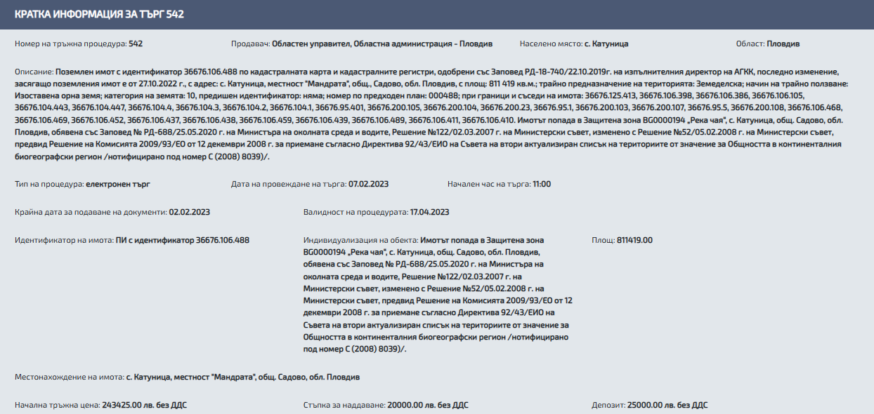 Обект на електронния търг е аграрен парцел в околност " Мандрата ", в землището на село Катуница, община Садово. Той е с повърхност от 811 419 кв.м. и съставлява земеделска земя, съгласно НТП " изоставена орна земя ". В същото време, защото парцелът е по поречието на река Чая, той съставлява предпазена територия, по кадастър част от " Натура 2000 ". Според документи на Министерство на околната страна и водите той изрично попада в Защитена зона BG0000194 „ Река чая “.