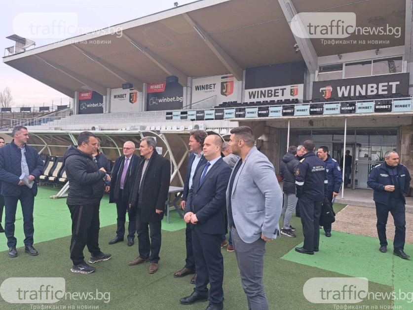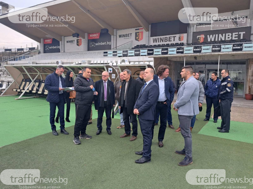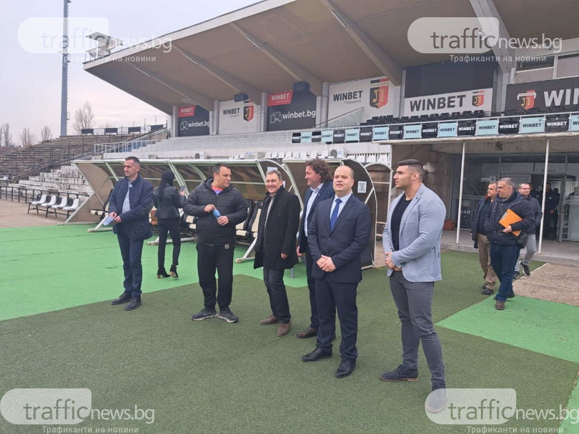 Те бяха посрещнати от отговорника по строителството от страна на Община " Пловдив " - Костадин Язов, който обясни какво остава да се извърши по стадиона.