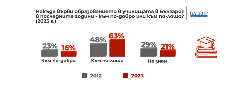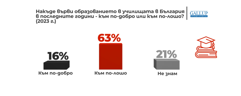 Образованието в учебните заведения у нас в последните години върви към по-лошо, считат 63% от българите. Това демонстрират резултатите от. Според 16% от интервюираните наклонността е към по-добро, а 21% не могат да дадат съответен отговор.