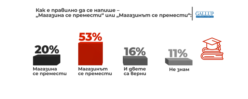 За задачата на изследването от " Галъп интернешънъл " попитаха хора на разнообразни възрасти по какъв начин е вярно да се изпише изречението " МагазинА се реалокира " или " МагазинЪТ се реалокира ".