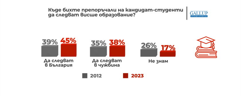 Въпреки тези данни, по-висок % от запитаните в изследването биха предложили на кандидат-студентите да продължат образованието си в България, а не в чужбина. 45% дават отговор, че ще дадат рекомендацията си за България, а 38% поучават да се продължи образованието в чужбина. 17 на 100 не могат да дадат отговор.