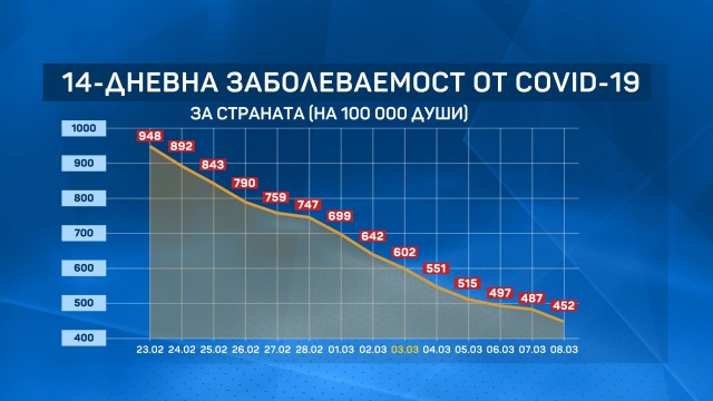 Общата заболеваемост от COVID-19 за страната спада до 452 на 100 000. За последните 7 дни заболеваемостта е минус 33% по отношение на предходните 7 дни.