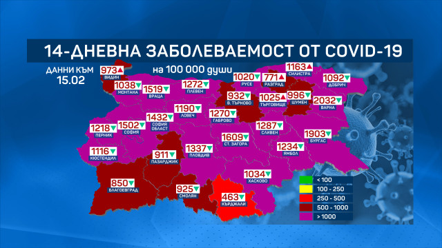 Общата заболеваемост в страната спада до 1317 на 100 000 по отношение на 1375 през вчерашния ден.