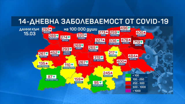 Общата заболеваемост за страната спада до 345 на 100 000. За последните 7 дни заболеваемостта за страната е минус 9% по отношение на предходните 7 дни.