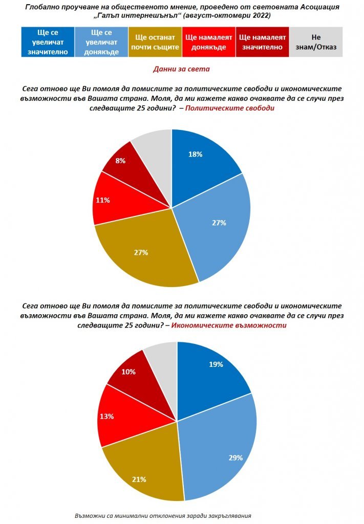 Очакванията за бъдещето наподобяват по-положителни, означават анализаторите. 45% чакат, че след 25 години политическите свободи в страната, в която живеят, ще се усилят (силно или най-малко в някаква степен). 19% чакат те да намалеят (да намалеят в известна степен или даже силно). 27% чакат политическите свободи да останат същите. Икономическите упования са още по-добри – половината от популацията на света чака, че икономическите благоприятни условия в страната им ще се усилят в границите на 25 години, а 23% са песимисти, обобщава Българска телеграфна агенция. Около една пета от интервюираните чакат опциите в стопанската система да останат същите след четвърт век.
