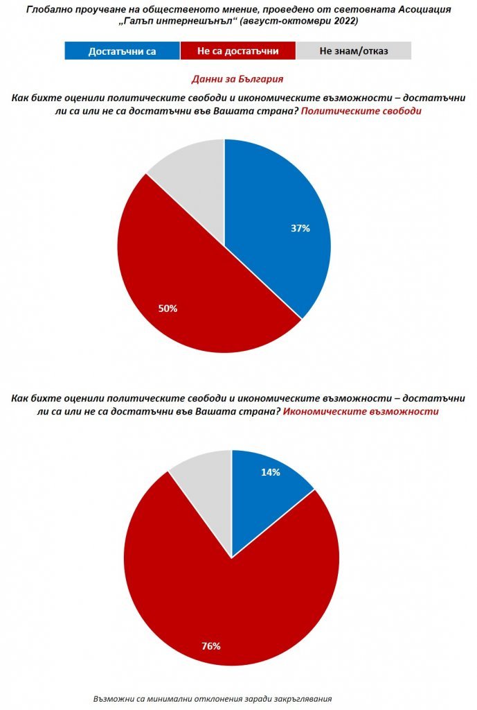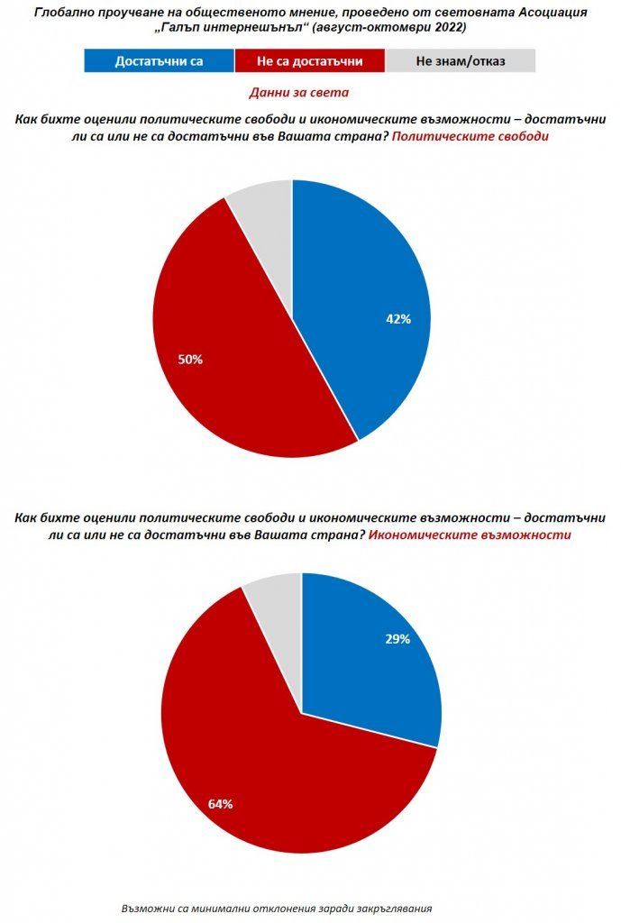 На въпроса за политическите свободи във вашата страна през днешния ден, в международен мащаб 42% считат, че политическите свободи са задоволителни, а 50%, че са незадоволителни. На въпрос за икономическите благоприятни условия в тяхната страна през днешния ден, 29% в международен мащаб считат, че опциите са задоволителни. 64% считат, че те са незадоволителни.