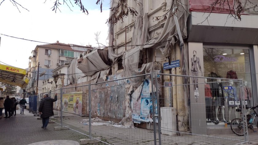 Община Бургас обезопасява рушаща се постройка в центъра на града. Само преди дни от фасадата са паднали няколко огромни части. Мястото обаче е извънредно оживено, от тук минават доста хора и с цел да не се стигне до тежък случай, се наложи част от ул. „ Апостол Карамитев “ да бъде заградена.