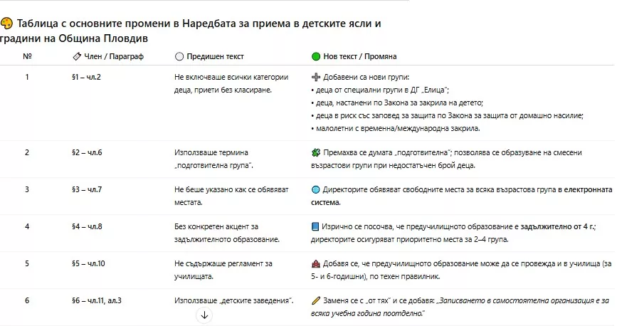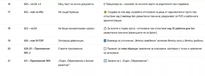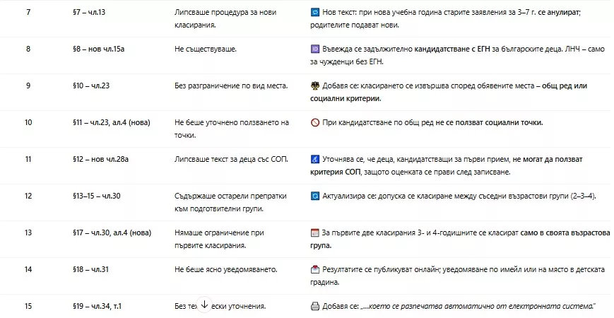 По мотив измененията в наредбите за детските заведения, те засягат както процедурите за записване и класиране, по този начин и метода на известяван на родителите и критериите за обществен банкет. Измененията ще вкарат редица основни промени, ориентирани към модернизиране на системата за банкет и повишение на нейната бистрота.