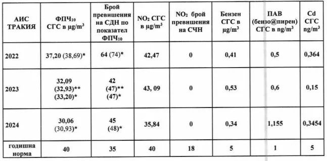 Всички останали индикатори, регистрирани от АИС „ Тракия “, покриват нормативните условия. Средногодишната норма за ФПЧ 10 е спазена, като даже се регистрира преднамерено понижаване на цената от 37,2µg/m³ през 2022г. до 30,04 µg/m³ през 2024г. Концентрацията на Бензен, азотен диоксид, кадмий е в норма, споделя Регионална инспекция за опазване на околната среда.