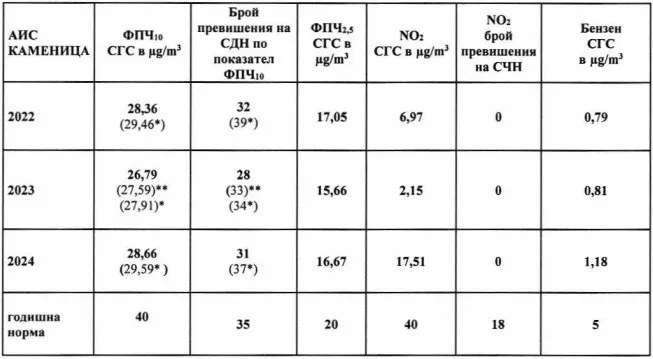 Автоматичната измервателна станция „ Каменица “, отчитаща общ градския декор на замърсяване, е покрила всички условия за миналата година, се показва още в оценката на екоинспекцията. Относително непроменена остава средногодишната концентрацията на ФПЧ 10 – 28,66 при норма 40 µg/m³. Любопитното тук е, че средноненонощната стойност по съответния индикатор 37 – също надвишава европейския стандарт от 35 възможни дни за година. При използване на методиката за приспадане на транспорт на необитаем пясък, одобрена от Министерски съвет, са били отстранени 6 дни. С това пресмятане Общината е съумяла да регистрира резултат, отговарящ на норматива.