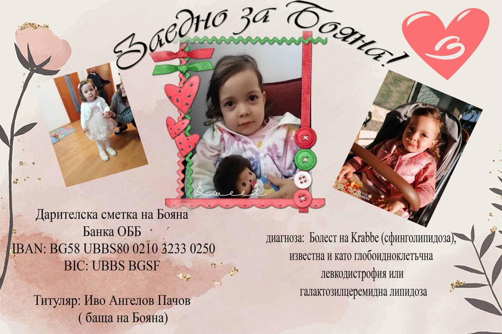 Само допреди три месеца Боянка тича, играе и е едно щастливо дете. До момента, в който ѝ е сложена страшната диагноза Болест на Krabbe (сфинголипидоза), известна и като глобоидноклетъчна левкодистрофия или галактозилцеремидна липидоза - рядко и постоянно съдбовно метаболитно заболяване.