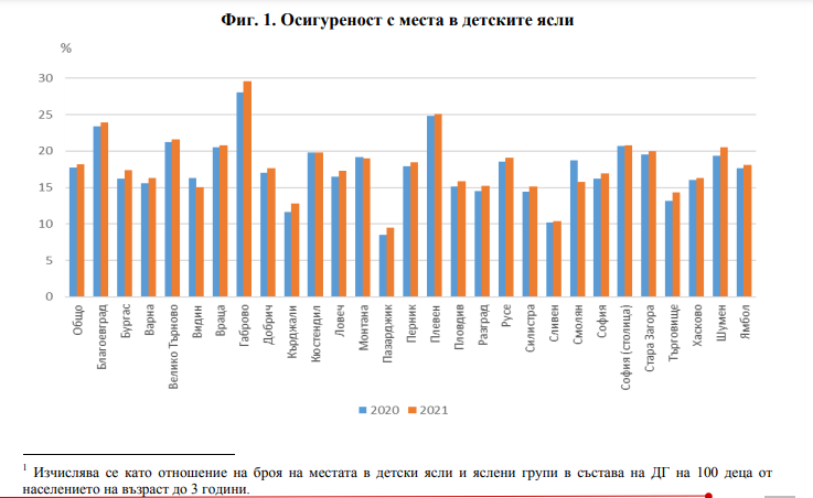 Най-висока е осигуреността с места в детски ясли в областите Габрово (29.5%), Плевен (25.1%) и Благоевград (23.9%), а найниска - в Пазарджик (9.5%) и Сливен (10.4%). В област София (столица) осигуреността с места съвсем не се трансформира, като по отношение на 2020 година тя нараства с 0.1 процентни пункта.