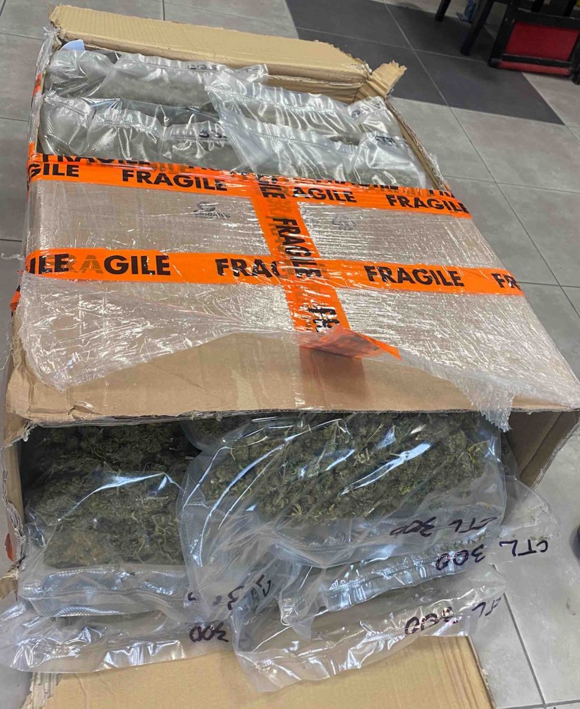 При отварянето на кашоните митническите чиновници откриват, че във всеки от тях има по пет термично залепени транспарантни полиетиленови плика, съдържащи суха зелена листна маса, наподобяваща съцветия на марихуана. Общото тегло на пакетите е 10,260 кг, а полевият наркотест реагира позитивно за съществуването на канабис.