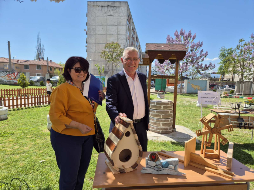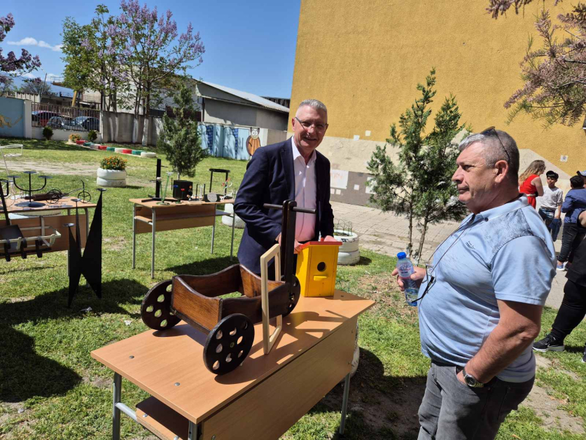 След музикално-танцовата стратегия кметът Емил Русинов прегледа изложбата с направени предмети по време на процедура от специалностите шлосерство и произвеждане на мебели.