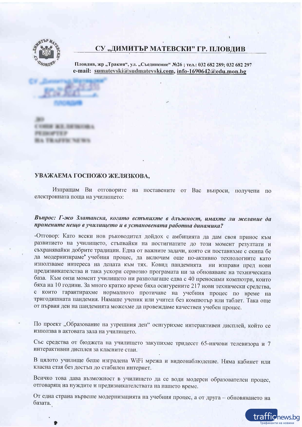 Попитахме я какво има да каже във връзка упрекът, че ръководството ѝ е обвързвано с основен чиновник на Община Пловдив: „ Не е загадка, че брачният партньор ми работи в кметството на регион „ Тракия “, само че длъжността, която заема, не е обвързвана със сферата на образованието “, съобщи шефът.