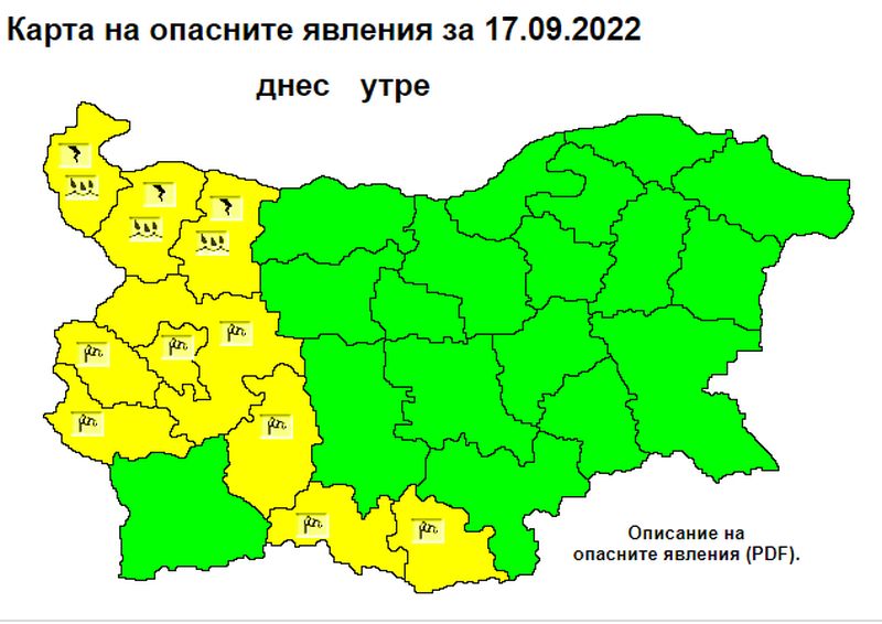 Общо предупредителният жълт код за на следващия ден е в действие за Видин, Монтана, Враца, София-град, София област, Перник, Кюстендил, Пазарджик, Смолян и Кърджали.