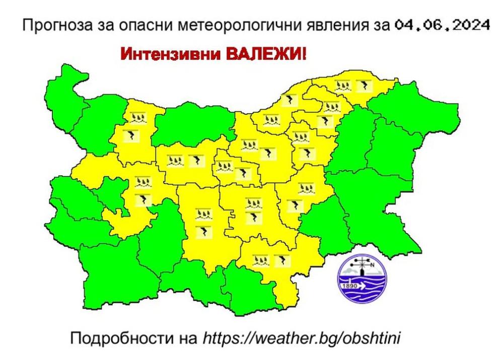 Интензивни превалявания ще има над областите Русе, Разград, Търговище, Велико Търново, Сливен, Стара Загора, Хасково, Пловдив, Габрово, Ловеч и София област.