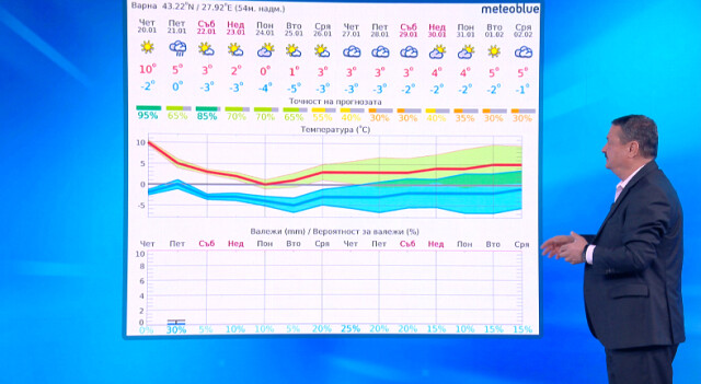 „ Варна и Бургас ще видят 1-2 см сняг. През идващите дни Варна ще бъде с негативни минимални температури, оптималните ще бъдат близки до 0 градуса “, добави климатологът.