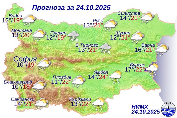Днес, 24 октомври, ще бъде облачно и прохладно, като от запад на изток ще има превалявания от дъжд. Националният институт по метеорология и хидрология (НИМХ) издаде предизвестие от първа степен (жълт код) за мощен и стремителен вятър за съвсем цялата страна.
