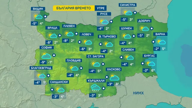 Ще духа до сдържан северен вятър. Минималните температури ще са най-вече сред минус 9 и минус 4 градуса, в София – към минус 9.