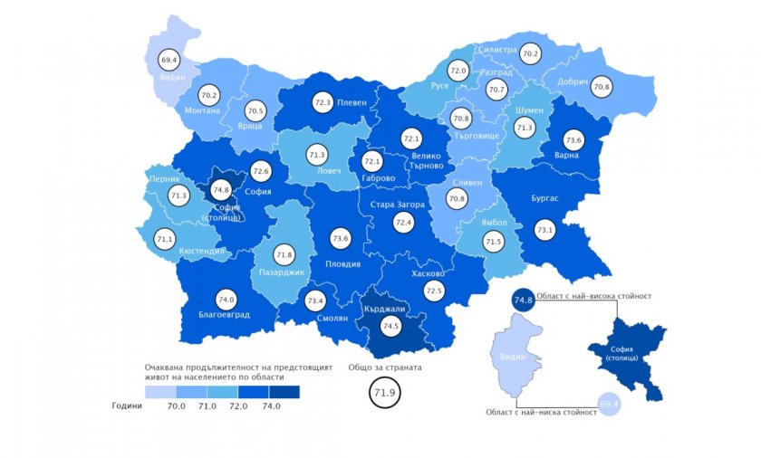 Съществени разлики в предстоящата дълготрайност на живота се регистрират на районно равнище. Очакваната дълготрайност на живота варира от 69.4 години в област Видин до 74.8 години в област София (столица), като общо в четиринадесет области тя е над междинната за страната.