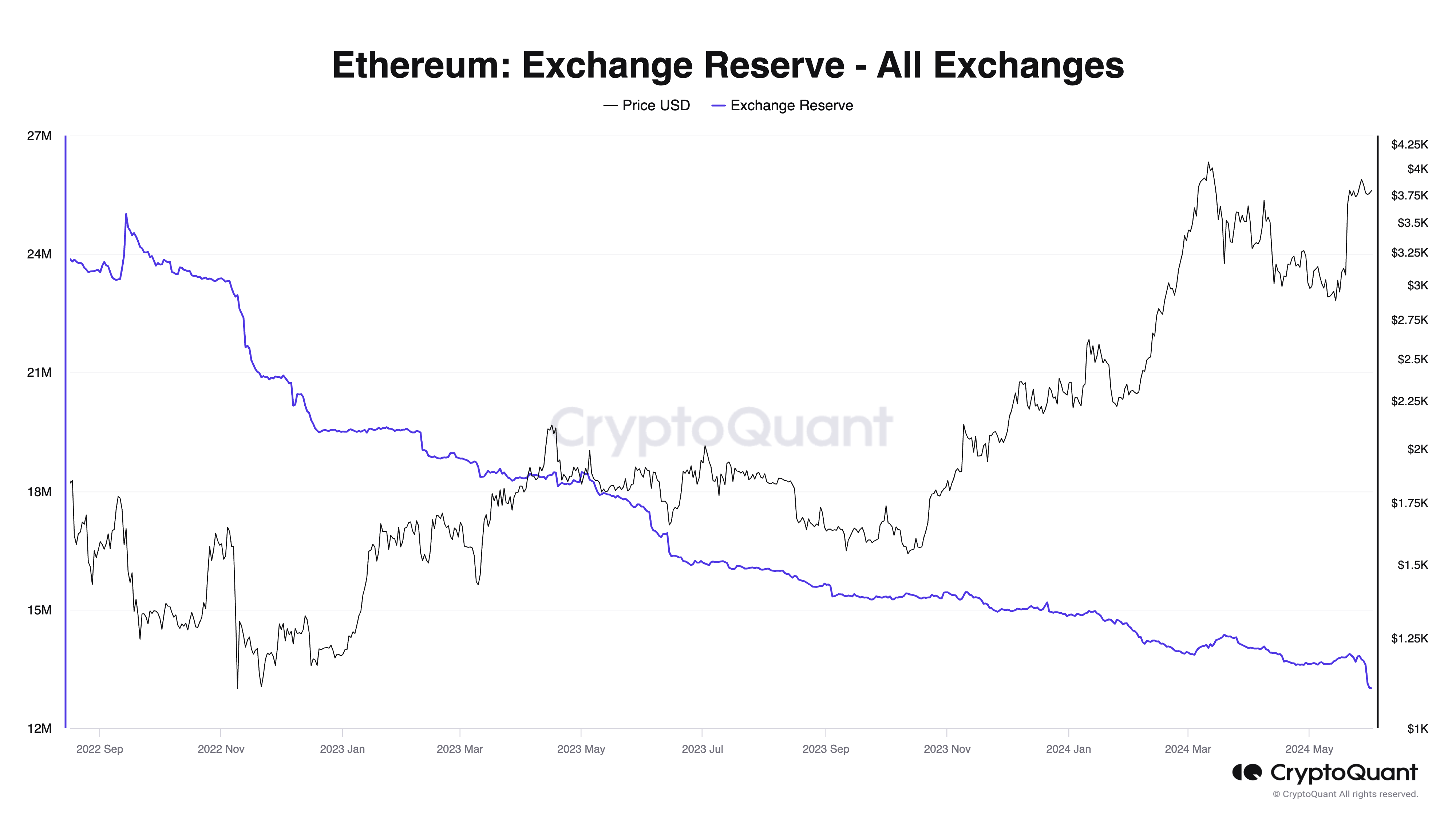 Тази наклонност подсказва, че доста вложители изтеглят своите ETH наличия от тържищата, което демонстрира възходящи настройки за задържане. Това усилва капацитета на Етериум да продължи ралито си над $4,000 през юни.