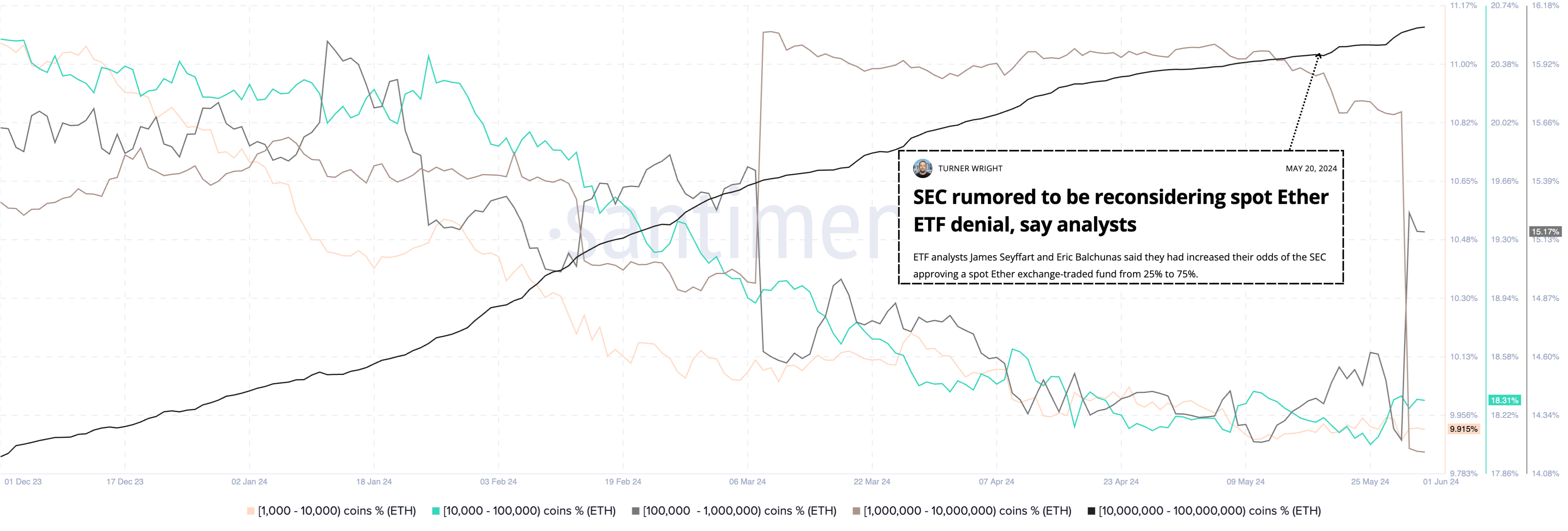 Данните за веригата от Santiment демонстрират, че предлагането на алткойна, държано от субекти с салда сред 10 и 100 милиона ETH, се е нараснало с почти 0.5% от 20 май насам. Това струпване стартира, когато се появиха клюки за преразглеждането на отводите на Комисията за скъпи бумаги и фондови тържища на Съединени американски щати (SEC) за спот Етериум ETF.
