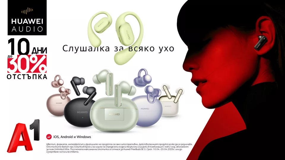 От 10 април до 20 април А1 България предлага специфична селекция безжични слушалки Huawei с до 30% отстъпка при покупка в брой или на лизинг с проект Unlimited Ultra от телекома.