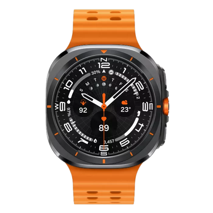 Премиум моделът Samsung Galaxy Watch Ultra надгражда опциите на базовата версия, като е най-здравият Galaxy Watch до момента. С титаниев корпус, сапфирено стъкло и водоустойчивост до 10ATM, устройството е готово да се оправи и с най-екстремните условия – от гмуркане и колоездене до преходи при височина до 9000 метра и температури до 55°C. Батерията с потенциал 590 mAh устоя до 100 часа в енергоспестяващ режим, а високият клас на отбрана и удароустойчивият дизайн подсигуряват надеждност даже при интензивно потребление.
