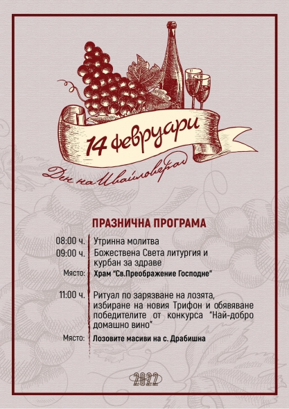 Програмата ще продължи от 11:00 ч. на лозовите масиви с обичайния обред по зарязване на лозята и избиране на новия Трифон, а в ход на програмата ще бъдат оповестени спечелилите от състезанието за най-хубаво домашно вино.